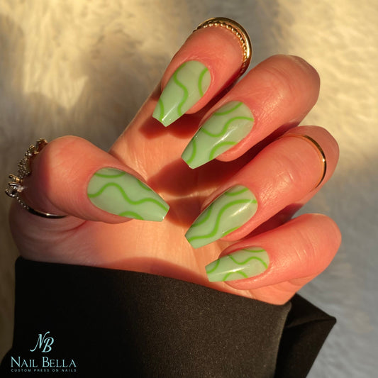 Green Swirl Mid Coffin Press On Nails / Nails with Designs / Fake Nails / Glue On Nails / Nail on Press Nail Short / Press on Nail Short